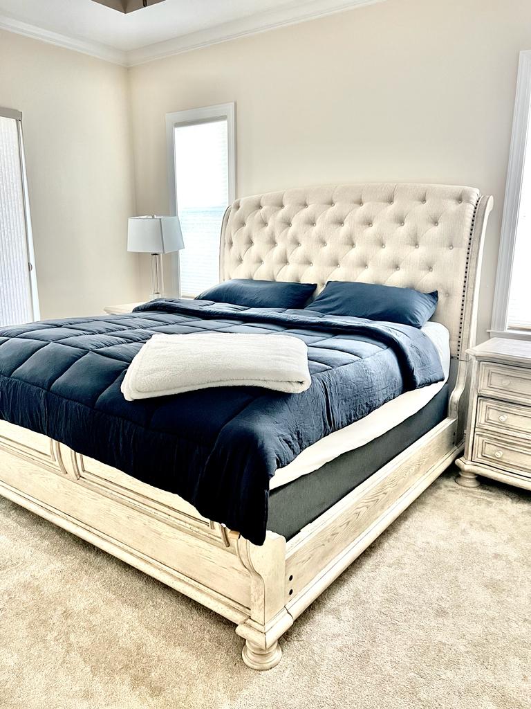 Queen–Size Bett, Kommode, Nachttisch, TV, Alexa, Stehlampe