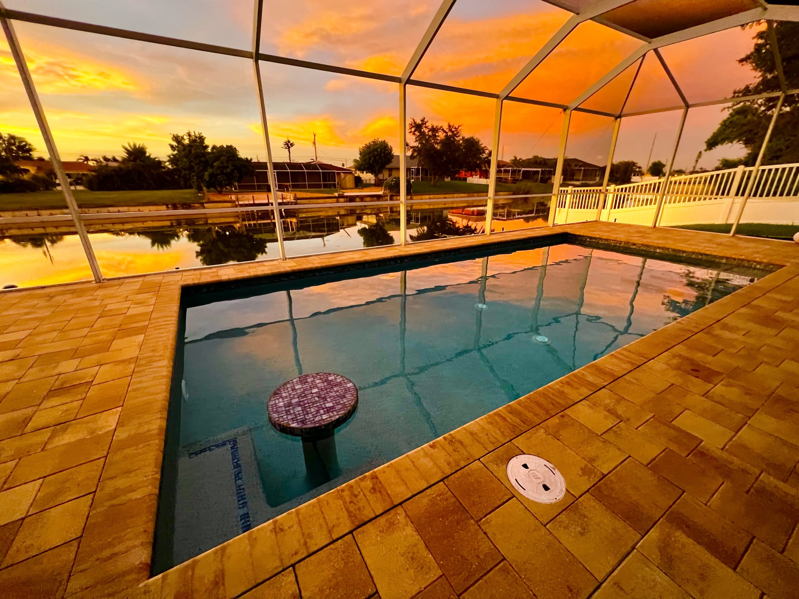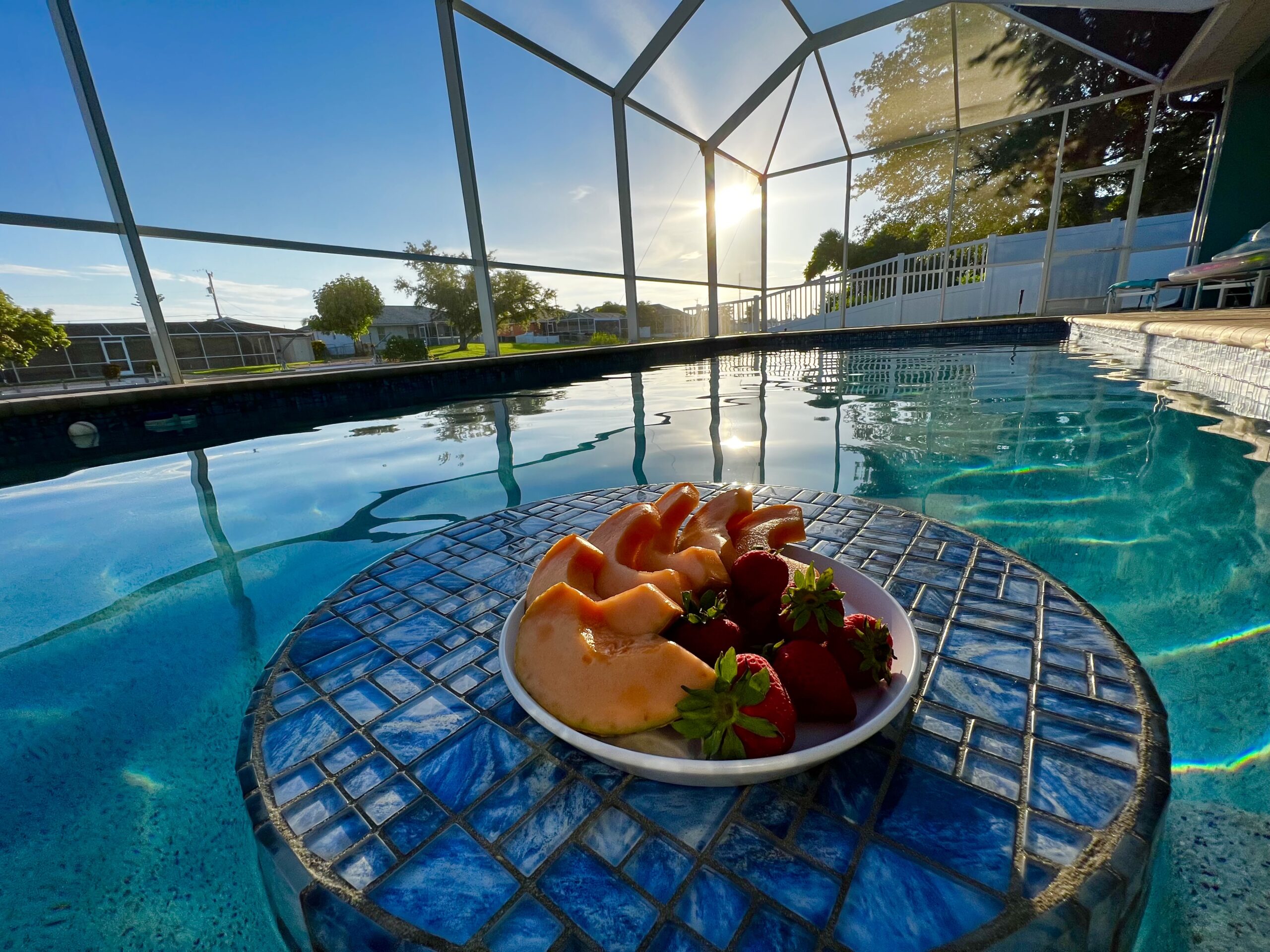 Loungemöbel mit Zierkissen, Poolhandtuchhalter, Poolhandtücher, 2 Liegen mit Auflage, Poolspielzeug, Sonnenschirm, Esstisch mit 6 Stühlen