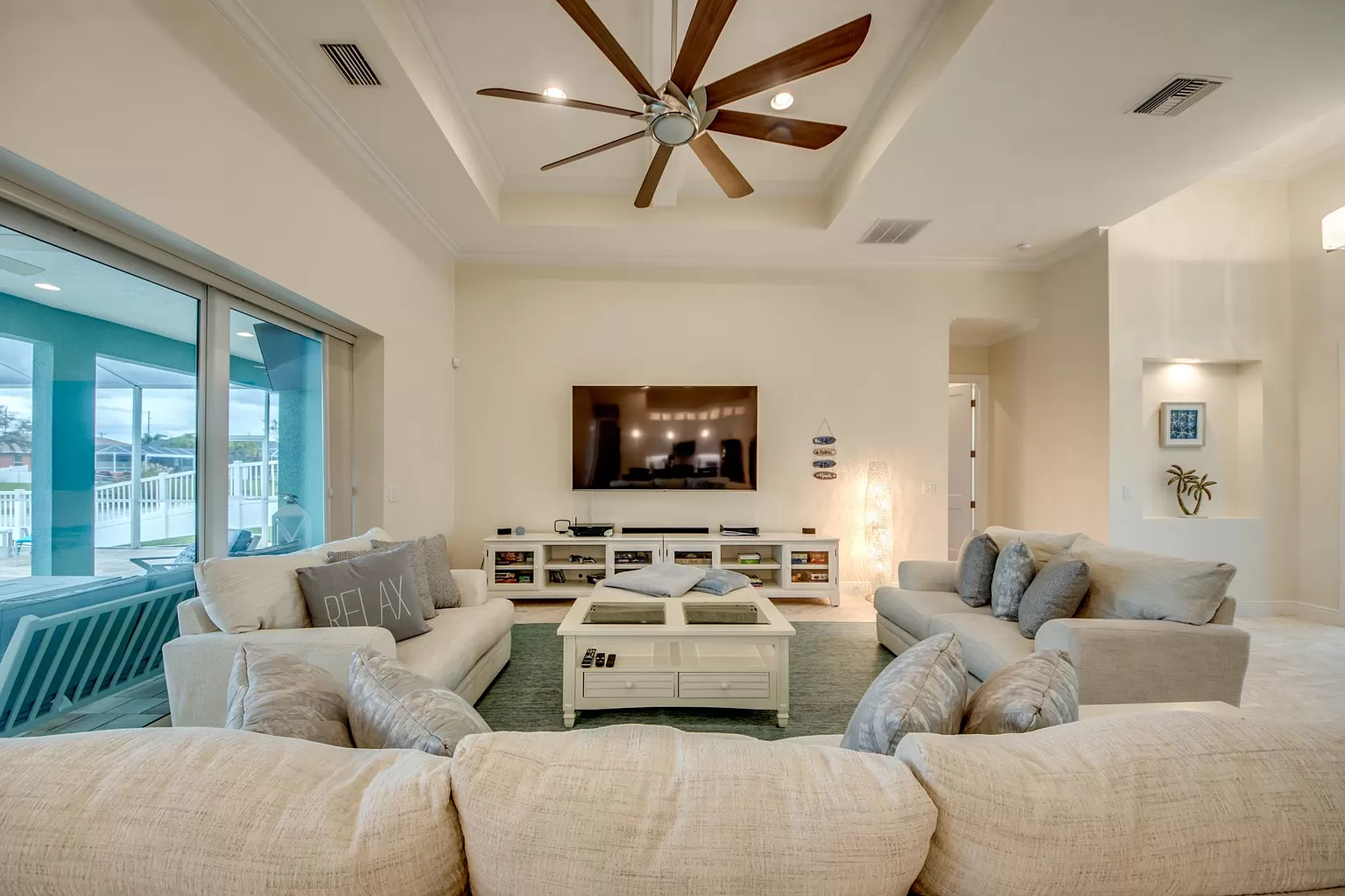TV, Couch, Lazychair, Zierkissen, Tisch, Alexa, Teppich &