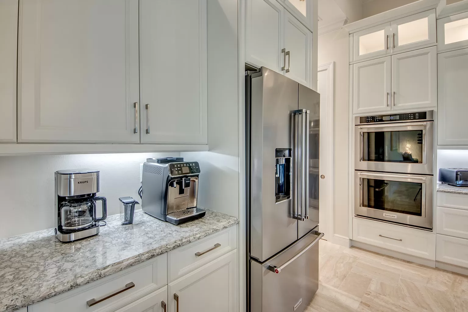 Kaffeevollautomat, Filter-Kaffeemaschine, Waffeleisen, Sandwich Maker, Toaster, Kühlschrank Side by Side, Spülmaschine, Doppelofen, Mikrowelle, Herd, Grillbesteck, Pancake Platte, Pool Geschirr, Wasserkocher, Große Teller, Frühstücksteller, Tassen, Frühstücksschüsseln, Sektgläser, Weingläser, Große Gläser, Kleine Gläser, Wassergläser, Messbecher, Backformen, Sieb, Töpfe mit Deckel verschiedene Größen, Pfannen mit Deckel verschiedene Größe, Babybesteck, Plastikbesteck, Besteckset, Suppenlöffel, Stellmesser, Messerblock mit 12 Messer, Doppelmülleimer, Schüsseln, Vasen